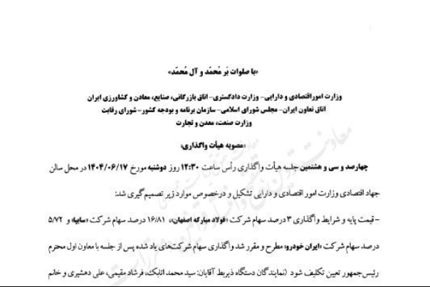 - قیمت پایه و شرایط واگذاری 3 درصد سهام شرکت فولاد مبارکه اصفهان، 16.81 درصد سهام شرکت سایپا و 5.72درصد سهام شرکت ایران‌خودرو.