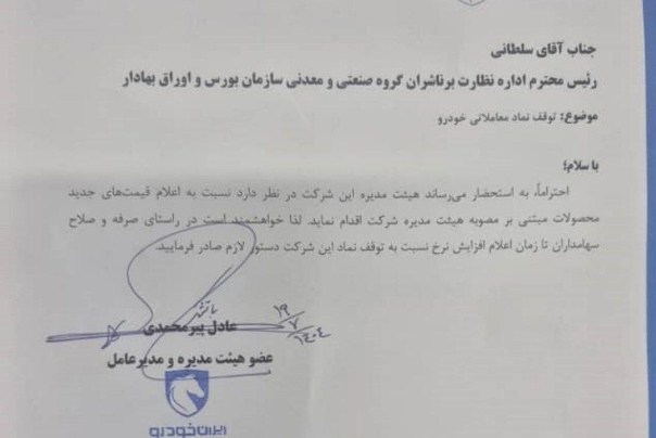 به نقل از تسنیم، شرکت ایران خودرو طی نامه ای به سلطانی رئیس ادامه نظارت بر ناشران گروه صنعتی و معدنی سازمان بورس و اوراق بهادار اعلام کرد: احتراماً به به استحضار می‌رساند هیئت مدیره این شرکت (ایران خودرو) در نظر دارد نسبت به اعلام قیمت جدید محصولات مبتنی بر مصوبه هیئت مدیره شرکت اقدام نماید.