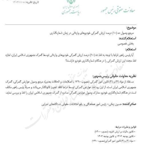 معاونت حقوقی ریاست‌جمهوری در نامه‌ای رسمی و صریح، بهمن ماه سال پیش اعلام کرد که مرجع وصول عوارض گمرکی، صرفاً گمرک جمهوری اسلامی ایران است و فراجا (پلیس راهور) هیچ مجوز قانونی برای اخذ این مبلغ ندارد. وظیفه پلیس راهور، تنها بررسی و استعلام پرداخت عوارض گمرکی در زمان شماره‌گذاری است؛ نه دریافت دوباره آن.