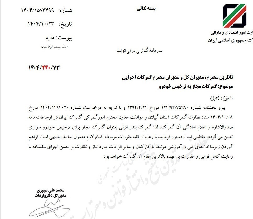 به گزارش خودرونگاران به نقل از تسنیم، بخشنامه گمرک جمهوری اسلامی ایران درخصوص تعیین گمرک بندر انزلی به عنوان گمرک مجاز برای ترخیص خودروی سواری با شماره 1404/1573499 در تاریخ 1404/10/23 توسط مدیرکل دفتر واردات گمرک جمهوری اسلامی ایران ابلاغ شد.